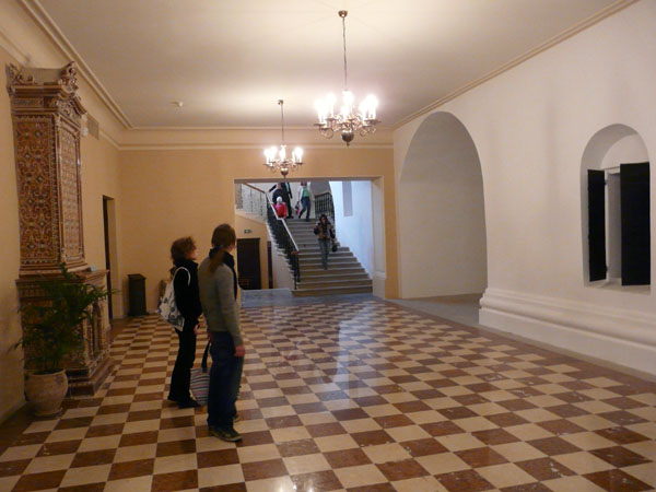 Біла стіна з вузькими прямокутними вікнами у нинішньому конференц-залі колись була зовнішньою і виходила прямо на подвір’я. Праворуч – урочисті сходи, які витіснили колись з ужитку тісний митрополичий коридорчик 18-го століття.