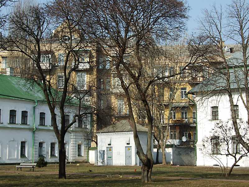 Ліворуч – фрагмент братського корпусу. В центрі – трансформаторна будка, через яку звільнили директора Заповідника Н.М.Куковальську. Праворуч – Фрагмент бурси. Все це – на тлі велененського дисгармонійного будинку по вул. Стрілецькій, 7/6. Вигляд зі сходу. 19 березня 2012 р. Фото М.І.Жарких.