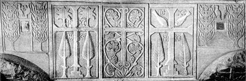 Фрагмент різьбленняРозмір зображення: 800:266 піксел Деталь саркофага Ярослава Мудрого. Державний історико-архітектурний заповідник «Софійський музей». Джерело: Історія українського мистецтва. – К.: Наукова думка, 1966 р., т. 1, с. 227. |