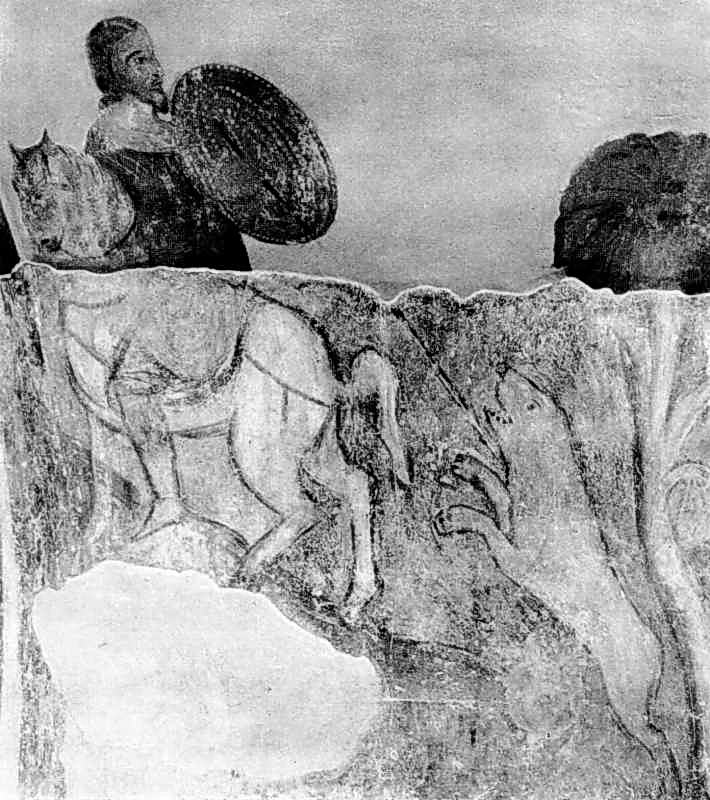 Вовк нападає на вершника. Фреска в південній вежі Софійського собору в Києві. XI ст.