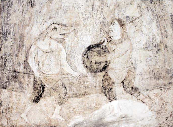 Боротьба ряджених (Готські ігри)Розмір зображення: 687:505 піксел Фреска північної сходової вежі. Джерело: Звід пам’яток історії і культури України. – К.: 2011 р., т. 3 (Київ), № 503-58. |