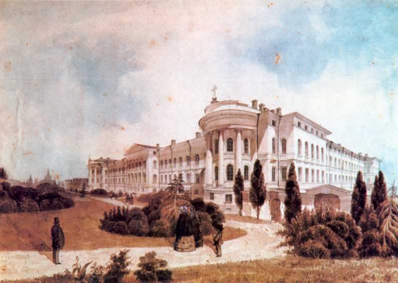 Будинок університету, зведений за проектом В. І. Беретті в 1837-1842 pp., зображено з північного заходу. Добре видно його парковий фасад, ще не огороджений і не закритий деревами. Ліворуч – споруди Старого Киева. Для наукових і учбових потреб при університеті 1841 р. був заснований Ботанічний сад (тепер – ім. академіка О. Фоміна) площею 22 га.