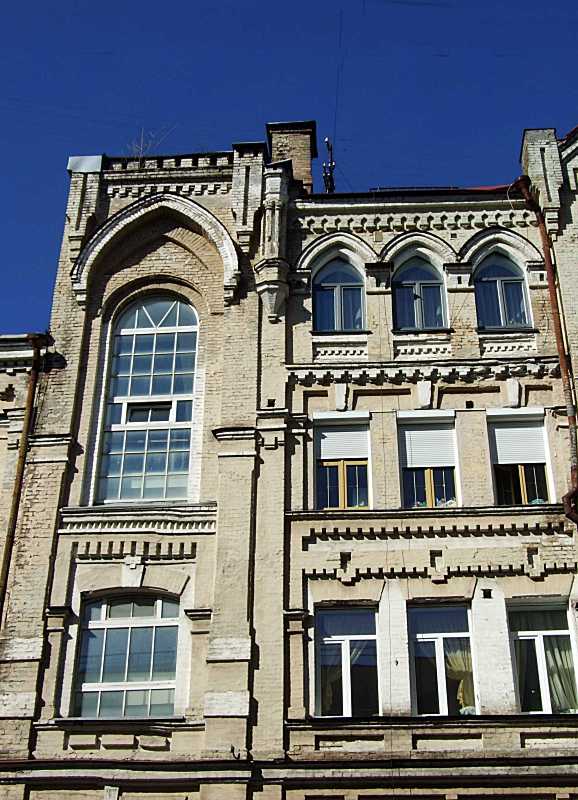 Фрагмент 3-5-го поверхів Розмір зображення: 578:800 піксел Фото М. І. Жарких, 16 березня 2020 р. Вкладені елементи Верхня частина сходової клітки Вікна 5-го поверху Вікна 4-го поверху Вікна 3-го поверху Вікна 2-го поверху