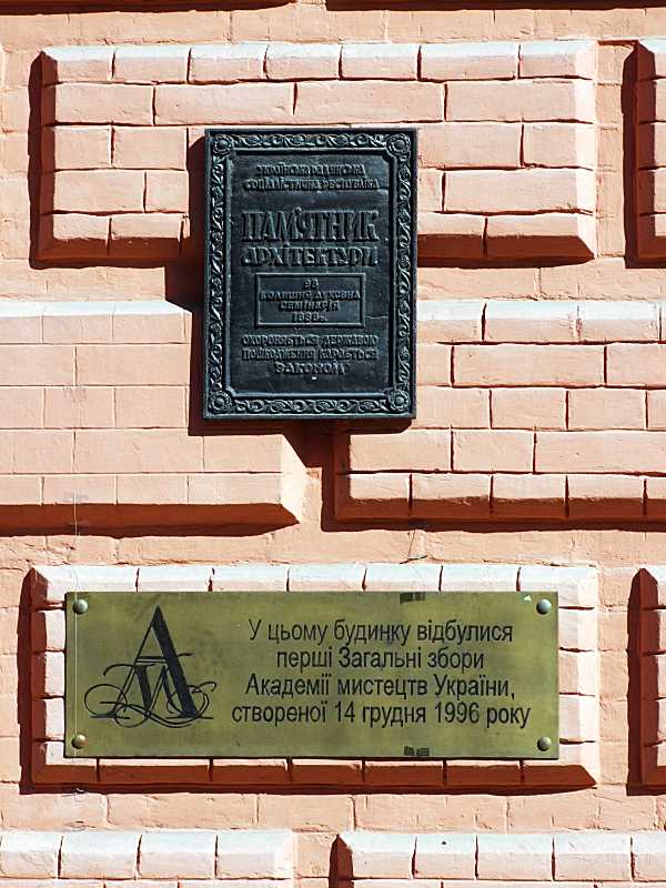 Меморіальна дошка Академії мистецтвРозмір зображення: 600:800 піксел Фото М. І. Жарких, 16 березня 2020 р. Напис: «У цьому будинку відбулися перші загальні збори Академії мистецтв України, створеної 14 грудня 1996 року». |