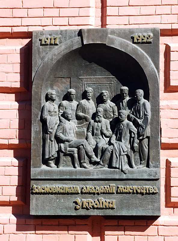 Меморіальна дошка засновникам Академії мистецтв України. Відкрита у 1994 році, скульптори М. Вронський, І. Овдійчук, архітектор В. А. Чепелик.