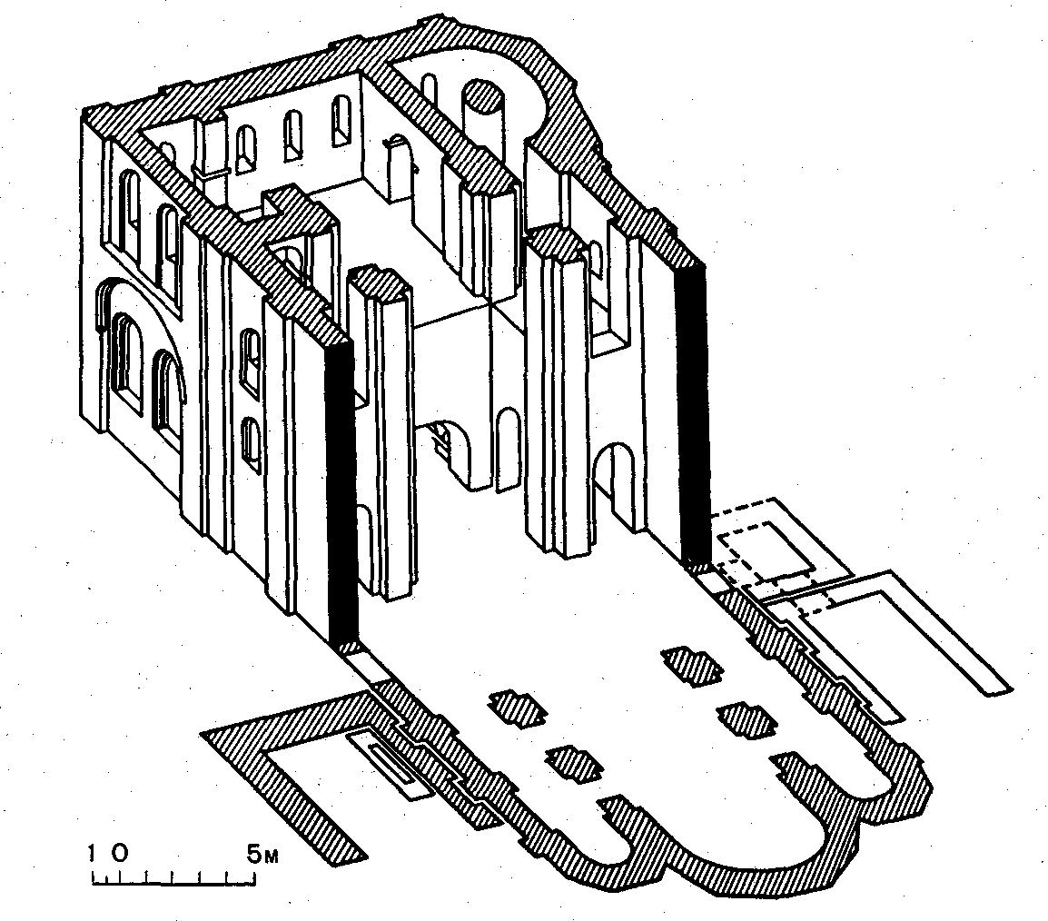 Аксонометричний перерізРозмір зображення: 1154:1014 піксел Аксонометрія Михайлівського собору Видубицького монастиря в Києві. 1070 – 1088 рр. За М. К. Картером. Джерело: Історія українського мистецтва. – К.: Наукова думка, 1966 р., т. 1, с. 174. |