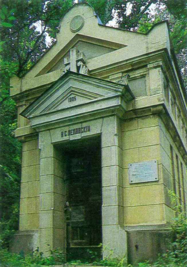 Надгробок виконано за проектом арх. В. Городецького у модернізованих формах, що являють вільні варіації на теми класицизму. Характерним для цього періоду є застосування залізобетону як основного будівельного матеріалу. Крім того, в окремих конструктивних та декоративних елементах використані природний камінь, дерево і метал. Зведеному над підземною поховальною камерою компактному об’єму квадратного у плані мавзолею надано вигляду урочистого храму-усипальниці. Враження значущості цієї споруди, розташованої на підвищеному рельєфі, підсилюється високим гранітним цоколем, монолітністю та масштабом архітектурних мас. Пропорції будівлі неординарні, з підкреслено потужними формами верхньої частини, що увінчує глухі, з нахилом, як у дамби, стіни з вузькими прорізами на торцях. Пам’ятник є результатом умовно-образного поєднання культової та гідротехнічної споруд і символізує фах небіжчика. Відштовхуючись від теми класичного ордера, архітектор акцентує чоловий фасад високим фігурним фронтоном, який спирається на масивний антаблемент; об’ємне виділяє вхідну частину стилізованим порталом, стіни розробляє рустом. Принцип варіативного повторення елементів архітектурної пластики фронтонів зберігається також у декоративних деталях – акротеріях та хрестах, що увінчують фронтони. Композицію доповнюють окуті залізом важкі дубові двері, які відповідають загальному враженню непохитності, монументальності надгробка.