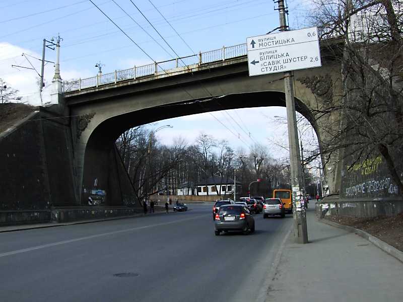 2011 р. Залізничний міст на тлі меморіальної садиби Т.Шевченка. Вигляд з півдняРозмір зображення: 800:600 піксел 18 березня 2011 р. Фото М.І.Жарких. |
