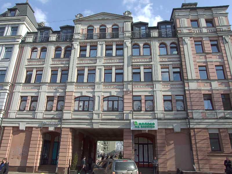 Цей великий житловий комплекс перерізає весь квартал віж вул. Спаської і Хоревою. Формально він має адресу вул. Спаська, 5.