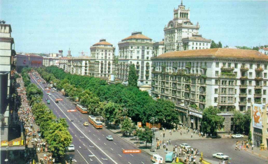 [1999 р.] Перспектива від рогу бульв.ШевченкаРозмір зображення: 1033:634 піксел Хрещатик, відбудований у 1948 – 1954 рр. Джерело: Звід пам’яток історії і культури України. – К.: 1999 р., т. 1 (Київ), с. 75. |