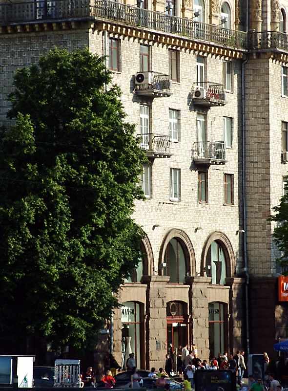 Фрагмент фасаду по Хрещатику Розмір зображення: 590:800 піксел 2008 р. 9 червня. Фото М.І.Жарких. Попередня сторінка | Вище | Наступна сторінка