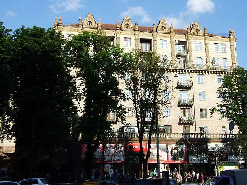 Житловий будинок, 1950 – 1951 рр., архітектори А.Власов, А.Добровольський, Б.Приймак [Памятники истории и культуры Украинской ССР. – К.: 1987 г., с. 29].