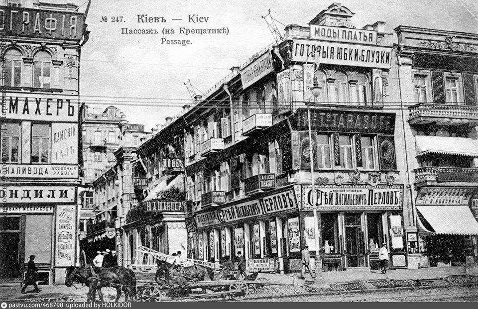 На плані 1925 р. прохід у двір з боку Хрещатика показано перекритим якимось будинком, тут його ще нема.