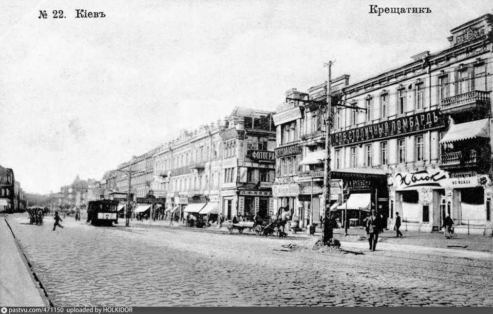 1900..1905 рр. Перспектива парного боку ХрещатикаРозмір зображення: 960:611 піксел Поштівку 1900..1905 рр. опублікував Олег Заварзін 8.12.2019 р. , також Орієнтовно будинки № 10 – 16, в глибині, здається, міську думу видно. |