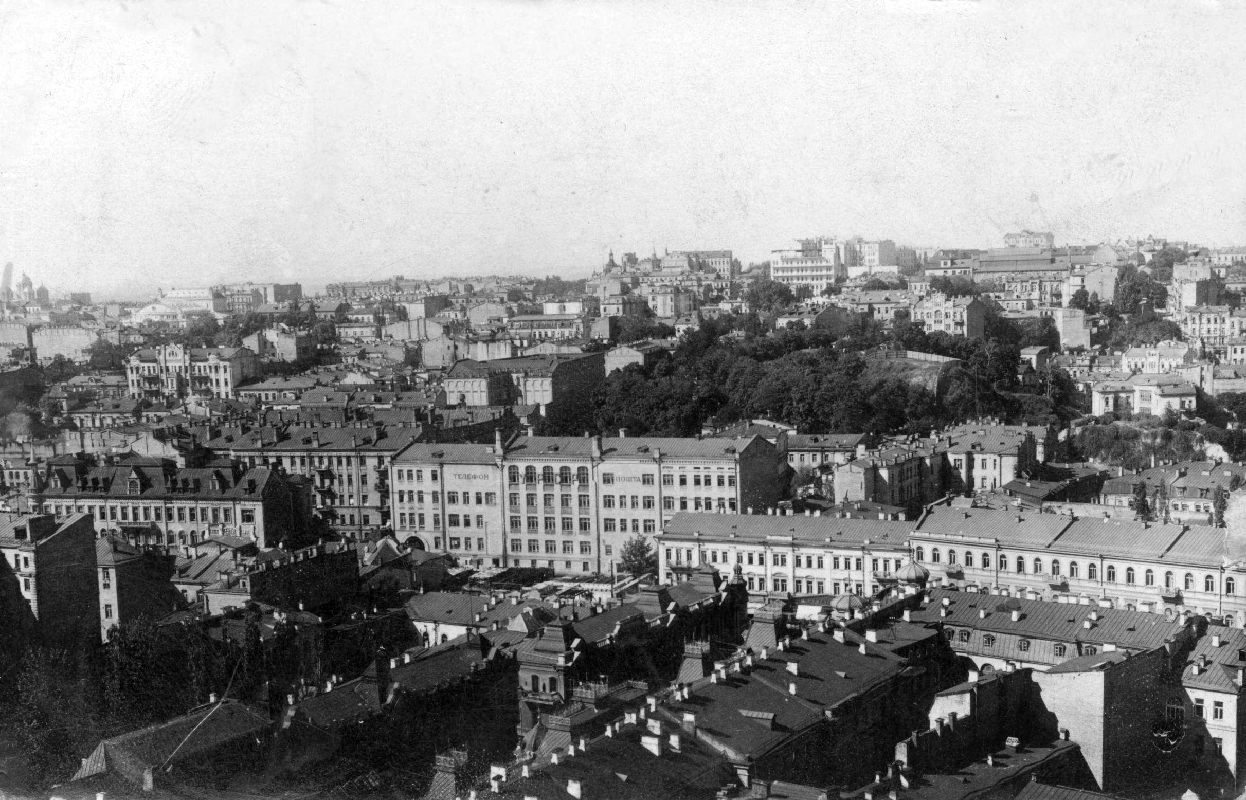 «Гранд-отель» (Хрещатик, 22) – другий від правого боку. Фото зроблено до побудови поштамту (ліворуч від отелю поки що порожнє місце).