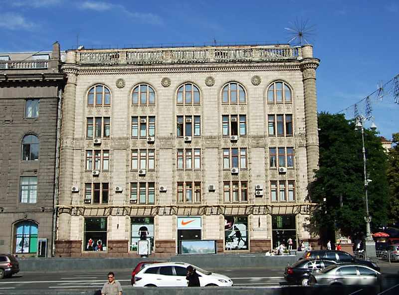 2008 р. Загальний вигляд з боку Хрещатика Розмір зображення: 800:591 піксел 2008 р. 25 червня. Фото М.І.Жарких. Вкладені елементи Вікно 4-го поверху Наріжна колона