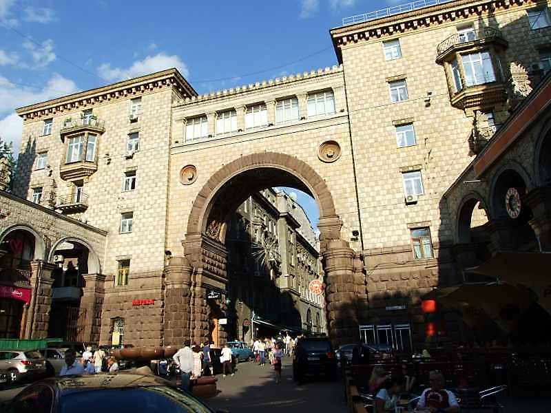 2008 р. Фасад з боку Хрещатика Розмір зображення: 800:600 піксел 2008 р. 9 червня. Фото М.І.Жарких. Вкладені елементи Рельєфна вставка Декор арки проїзду