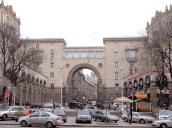 Монументально трактовану головну арку пасажу заввишки у три поверхи вирішено у характерних формах т. зв. радянського ампіру (радянського бароко). У декорі фасадів застосовано високе рустування колотим натуральним каменем, профільовані карнизи, ліплення. Двоповерхові об’єми обабіч входу з відкритими терасами утворюють курдонер.