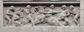 Рельєфи виконано на теми античної міфології в характерній стилістиці неокласицизму. Це, зокрема, сцени діонісійських процесій з купідонами та Діонісом в образі дитини на леві, парні групи – Венера і Марс та Нептун з німфою і дельфіном, окремі символічні вставки із зображеннями орла (символ Зевса), амурів, сов (символ богині мудрості Афіни), рогів достатку тощо. Вони виконані у поширеній в 1890 – 1910-х рр. імпресіоністичній манері й ефективно контрастують з великими стіновими площинами фасадів пасажу.