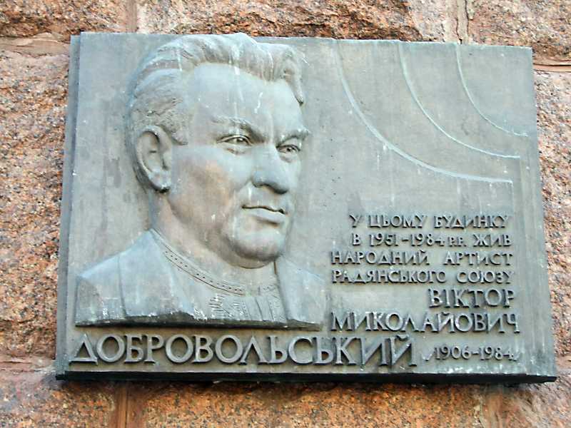 На дошці напис: «У цьому будинку в 1951 – 1984 рр. жив народний артист Радянського Союзу Віктор Миколайович Добровольський (1906 – 1984)».