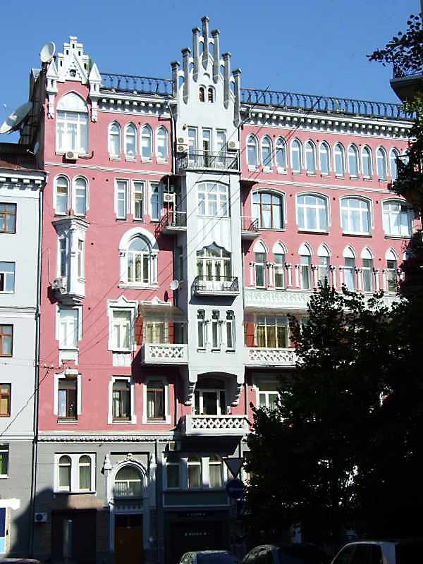 2008 р. Фрагмент головного фасаду Розмір зображення: 600:800 піксел 4 липня 2008 р. Фото М.І.Жарких. Вкладені елементи Наріжна башточка Фронтон