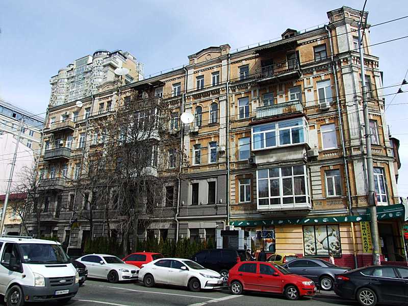 2020 р. Фасад по вул. Жилянській Розмір зображення: 800:600 піксел Фото М. І. Жарких, 13 березня 2020 р. Вкладені елементи Фрагмент 2-5-го поверхів (+)