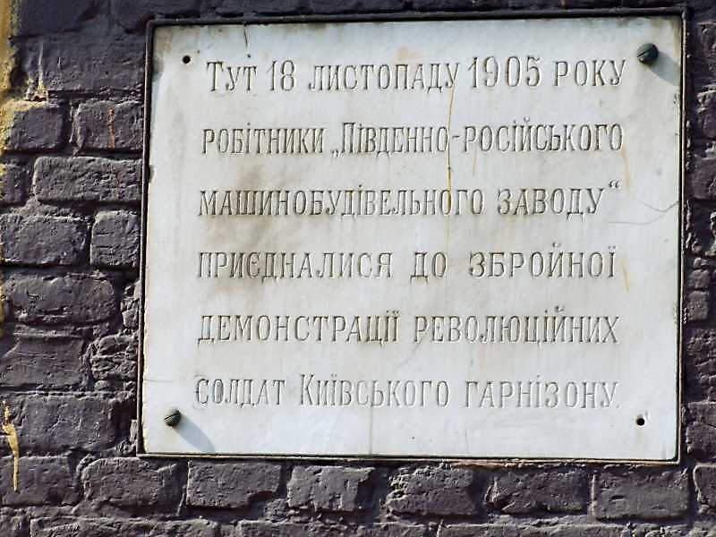Меморіальна дошка демонстрації 1905 р.Розмір зображення: 800:600 піксел 7 квітня 2009 р. Фото М.І.Жарких. Меморіальні дошки встановлені у 1947 і 1955 рр [Памятники истории и культуры Украинской ССР. – К.: 1987 г., с. 26]. |