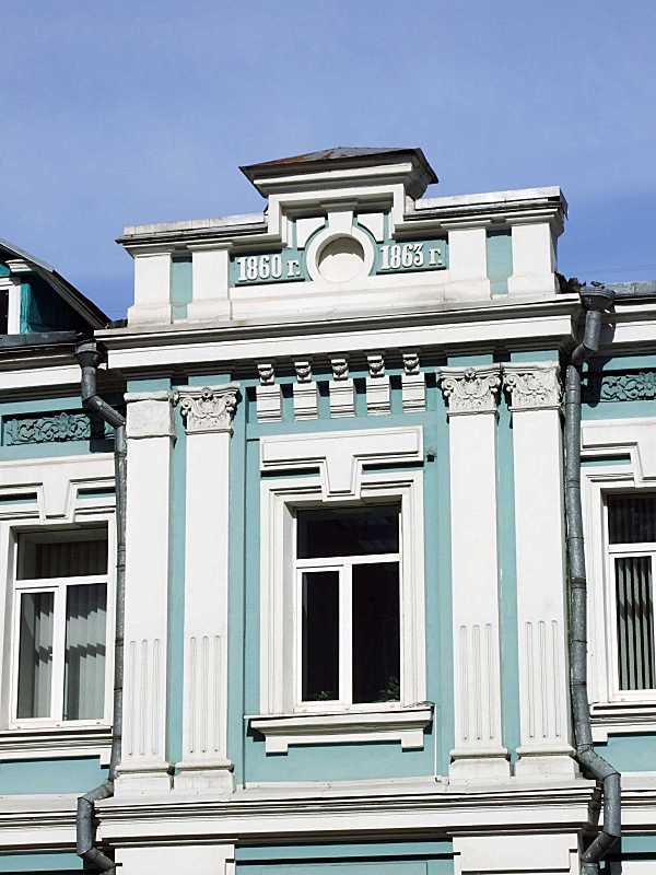 Вікно 2-го поверху Розмір зображення: 600:800 піксел Фото М. І. Жарких, 13 березня 2020 р. Вкладені елементи Центральний фронтон з датами 1860 – 1863
