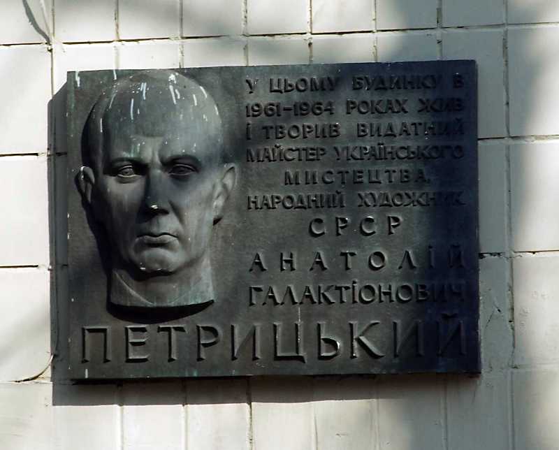 На дошці напис: «В цьому будинку в 1961 – 1964 роках жив і творив видатний майстер українського мистецтва, народний художник СРСР Анатолій Галактіонович Петрицький».