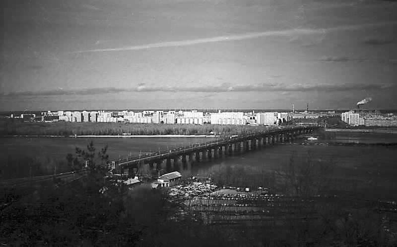 1977 р. Русанівка і міст ПатонаРозмір зображення: 800:499 піксел Вигляд з південного заходу, з мису Чайка. 1977 р. 6 березня. Фото М.І.Жарких. Негатека, № A237-06. |