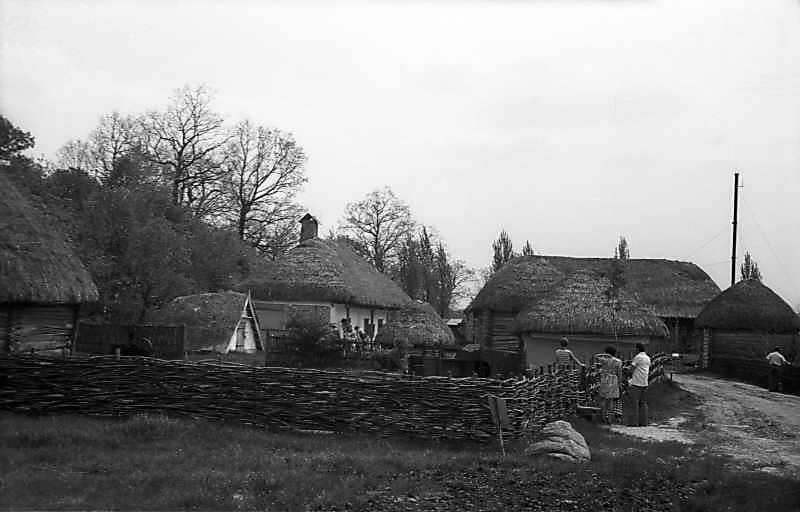 Погрібник, хата, саж, комора, повітка; вдалині – гамазей та комора із с.Нещеретове. 1977 р. 8 травня. Фото М.І.Жарких. Негатека, № A260-31.