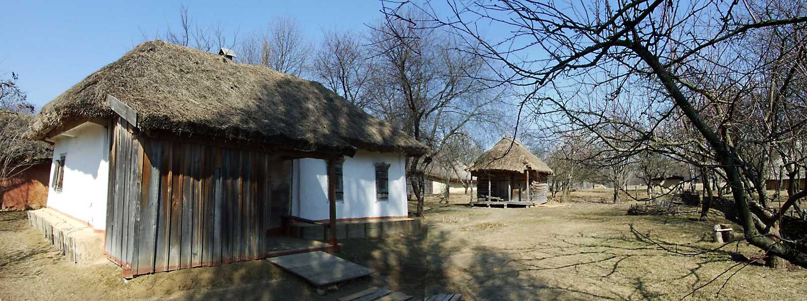 2011 р. Панорама з боку вулиці (хата, комора, гончарна піч)Розмір зображення: 1600:597 піксел 30 березня 2011 р. Фото М.І.Жарких. |