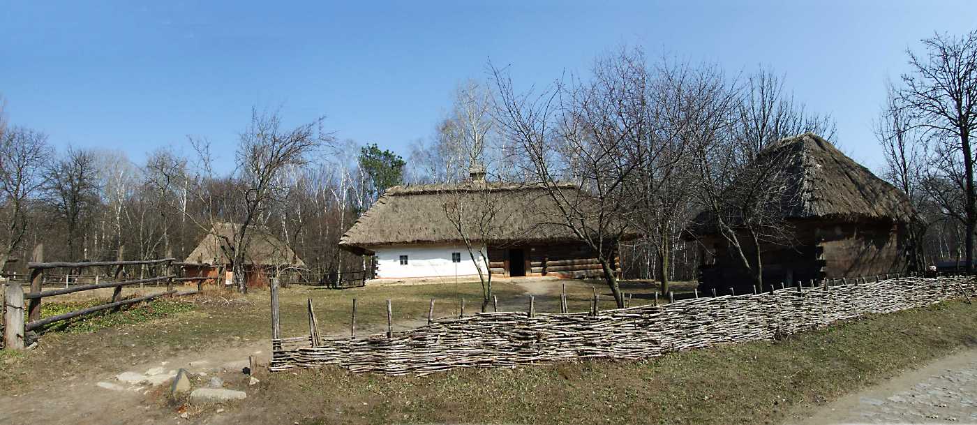 2011 р. Панорама з боку вулиці (повітка, хата, комора)Розмір зображення: 1400:609 піксел 30 березня 2011 р. Фото М.І.Жарких. |