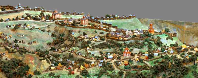 В лівому верхньому куті видно фрагмент укріплень городу Ярослава з Жидівською брамою. Праворуч від неї – церква 1887 р., ще праворуч (в центрі кадра) – церква 1947 р., біля правого краю – церква 1878 р. На передньому плані – плато Замкової гори з дерев’яною церквою.
