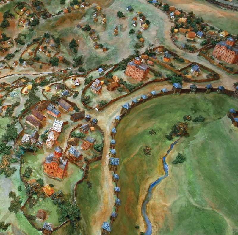 Біля нижнього краю кадра – церква 1878 р., в центрі – церква 1947 р., біля правого краю – церква 1887 р. По діагоналі кадра проходить лінія укріплень Копиревого кінця, праворуч від неї – долина річки Глибочиці.