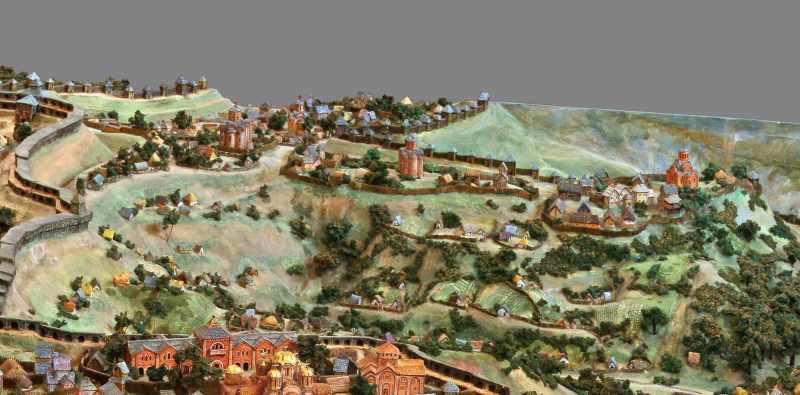 Зліва – церква 1887 р., праворуч від неї – церква 1967 р., ще праворуч – церква 1947 р., біля правого краю – церква 1878 р. На передн,ому плані – фрагмент города Володимира.
