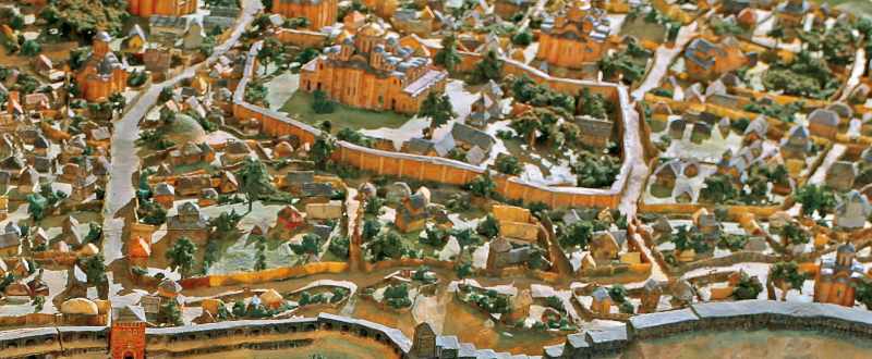 “Аерофотознімок” центральної частини з півночіРозмір зображення: 800:330 піксел В центрі кадра – Софійський собор з митрополичим двором. |