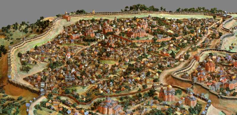 Вигляд з південного сходу. На передньому плані – частина города Ізяслава, справа – частина города Володимира.