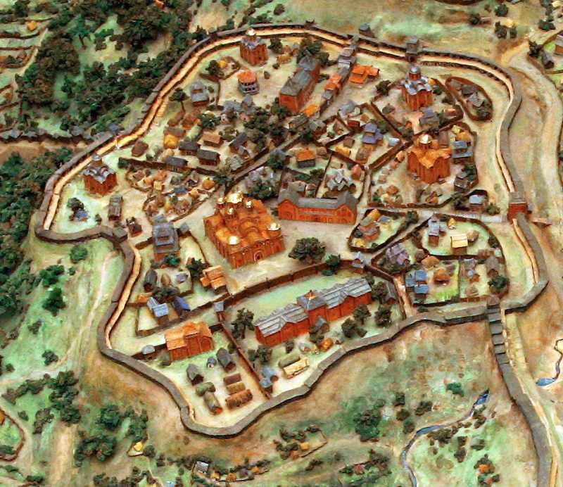 Найближче до глядача – князівський двір з великом палацом. На осі палацу розміщено Десятинну церкву. Лівіше від неї – Подільські ворота і церква Воздвиження, правіше – ще один палац. Біля верхнього краю кадра видно церкву св.Василя, праворуч від неї – собори Янчиного та Федорівського монастирів. Біля правого краю кадру – Софійські ворота і міст, що веде до города Ярослава.