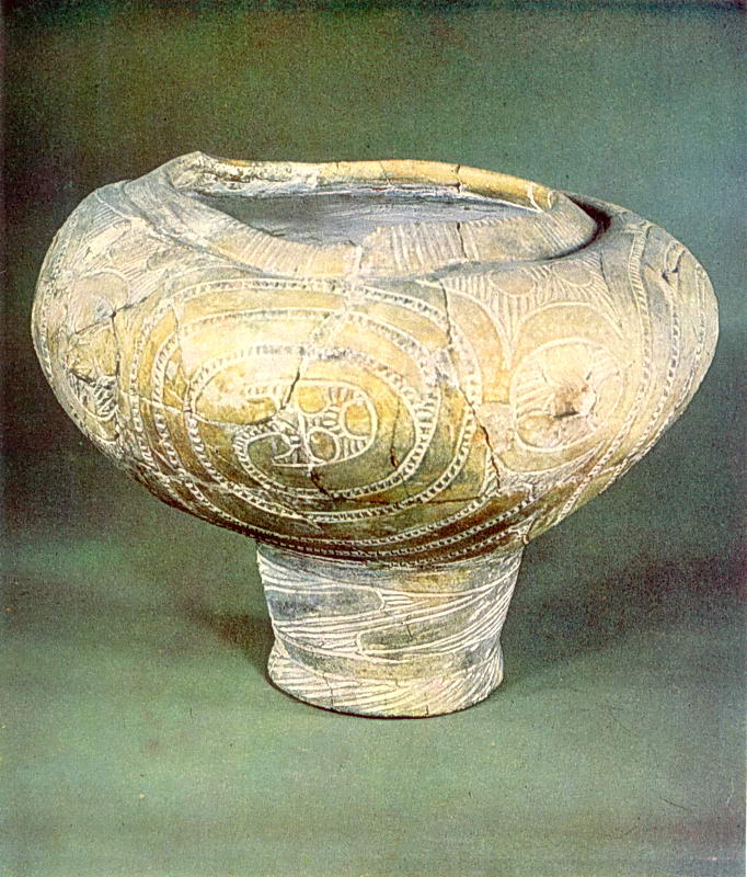 Сосуд относится к числу лучших образцов раннетри-польской керамики. Своеобразна его форма – шаровидный корпус на цилиндрической ножке с плитчатым поддоном. Орнамент выполнен заостренной палочкой по сырой глине. Расположенные в центре корпуса четыре налепа заключены в медальоны, между которыми дано стилизованное изображение змеи с раздвоенным хвостом, свернувшейся в клубок. Тело змеи передано спиралью из заштрихованных лент, голова выполнена тем же приемом, что и медальоны: два круга обозначают глаза, третий – рот. Хвост, а также фестоны, расположенные у венчика и в нижней части корпуса, окружают медальоны, подчеркивая четырехчастную систему всей композиции. Изображение змеи на сосуде связано, вероятно, с представлением об этом животном как о обереге.