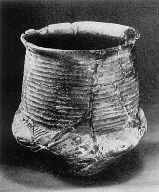 Сосуд отличается изяществом формы. Высокое цилиндрическое горло переходит в биконический корпус с четырьмя сосцевидными налепами. Нарядный вид придают изделию каннелюры, опоясывающие горло, и углубленный орнамент на корпусе.