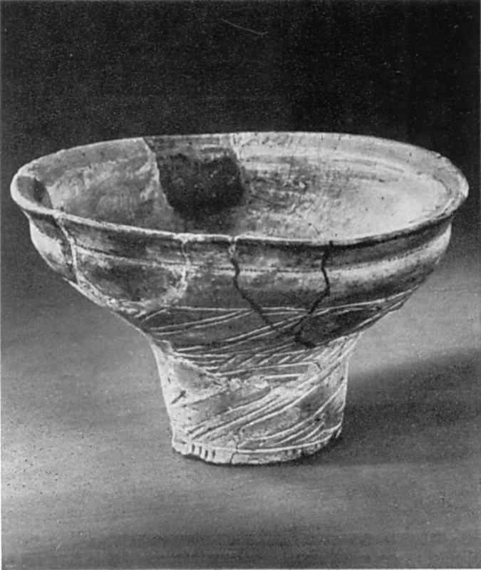 Открытый усеченно-конический корпус вазы переходит в высокий цилиндрический поддон. Рисунок выполнен заостренным инструментом по сырой глине. Корпус чаши украшен фризом из овалов с лучами, заключенными между двумя линиями. Поддон орнаментирован спиральной композицией.
