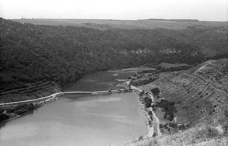 1995 р. Долина р. Тернава і міст. Вигляд зі сходуРозмір зображення: 800:514 піксел Ліворуч дорога з моста йде до с. Врублівці, праворуч – до с. Китайгород. 1995 р. 3 серпня. Фото М.І.Жарких. Негатека, № 875-08. |