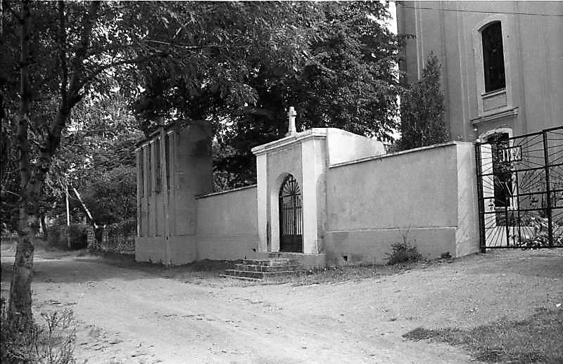 1995 р. Дзвіниця та брама. Вигляд з позиції А3Розмір зображення: 800:518 піксел 1995 р. 3 серпня. Фото М.І.Жарких. Негатека, № 874-32. |