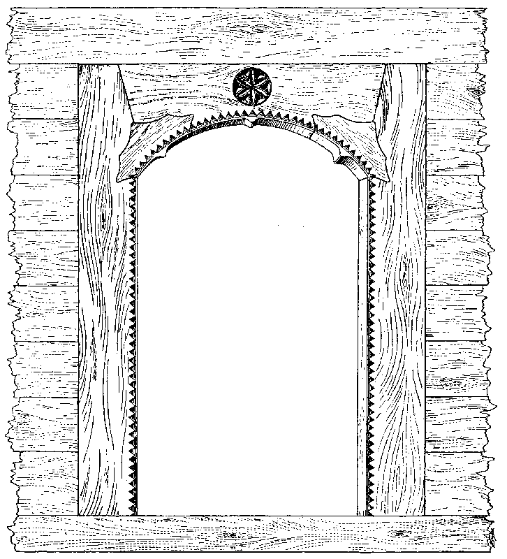 Одвірки церковні XVIII віку, с. Лавочне, ГаличинаРозмір зображення: 726:800 піксел Джерело: Українське мистецтво. І. Деревляне будівництво і різьба на дереві / В.Щербаківський. – Льв.: 1913 р., № 48. |