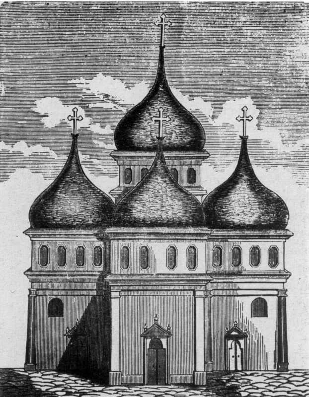 Лаврів. Церква св. Онуфрія, XV ст. Вигляд до перебудови другої пол. XIX ст. Рисунок з книжки Т. Білоус «Церкви русскія в Галиціи и на Буковині», Коломия, 1877.