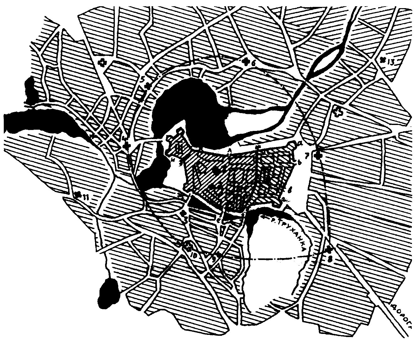План Лебединської фортеці початку XVIII ст.Розмір зображення: 1329:1111 піксел І – Великий осадний город; II – Малий осадний город; III – Замок; а – м – фортечні брами й бастіони; 1 – 13 – церкви Джерело: Пам’ятки України, 2001 р., № 4, с. 86. |