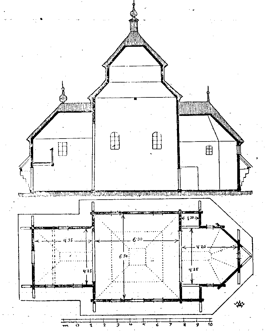 Поздовжній переріз і планРозмір зображення: 888:1111 піксел Лежахів. Церква 1796 р. (дерев.). Джерело: Драган М. Українські деревляні церкви. – Льв.: 1937 р., т. 2, с. 114. |