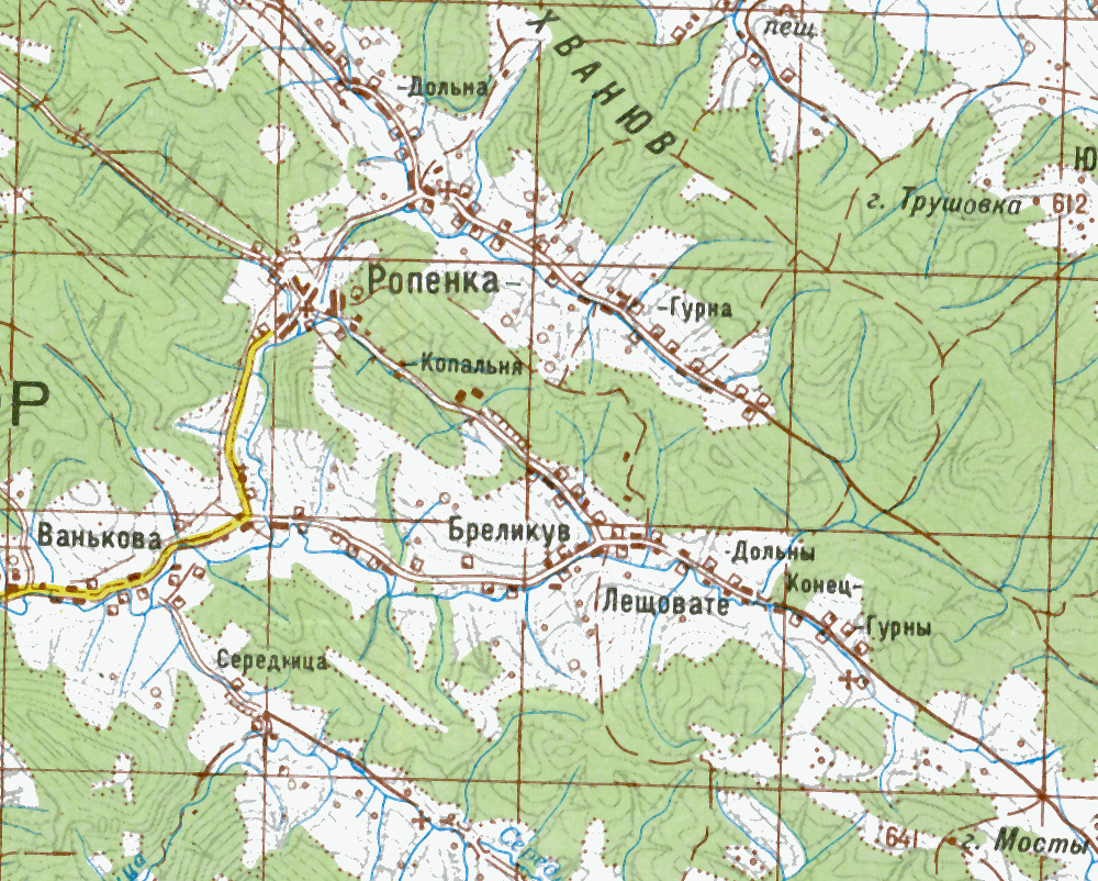Карта (Лещовате)Розмір зображення: 1000:802 піксел Карта Київської військово-картографічної фабрики, масштаб 1:100000, аркуш 106, друк 2001 р. (за матеріалами 2000 р.). |