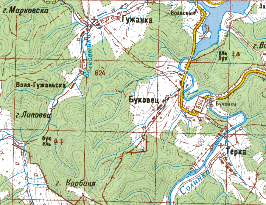 (Воля-Гужаньська) Карта Київської військово-картографічної фабрики, масштаб 1:100000, аркуш 125, друк 2001 р. (за матеріалами 2000 р.).